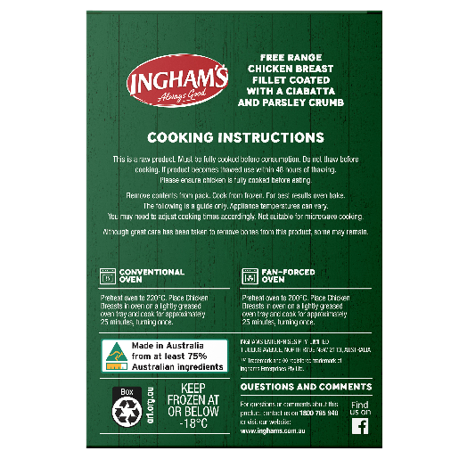 Ingham’s Free Range Chicken Breast Fillet With A Ciabatta And Parsley Crumb is made with chicken breast that contains no artificial colours, flavours or preservatives.