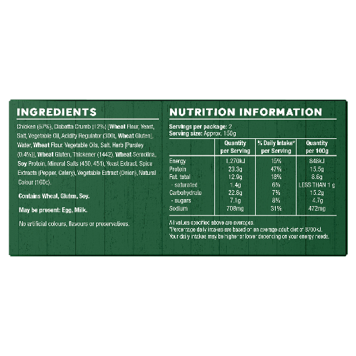 Chicken (57%), Ciabatta Crumb (12%) (Wheat Flour, Yeast, Salt, Olive Oil, Acidity Regulator (300), Wheat Gluten), Water, Wheat Flour, Vegetable Oil, Salt, Herb (Parsley (1.4%)), Wheat Gluten, Thickener (1442), Wheat Semolina, Soy Protein, Mineral Salts (450, 451), Yeast Extract, Spice Extracts (Pepper, Celery), Vegetable Extract (Onion), Natural Colour (160c).