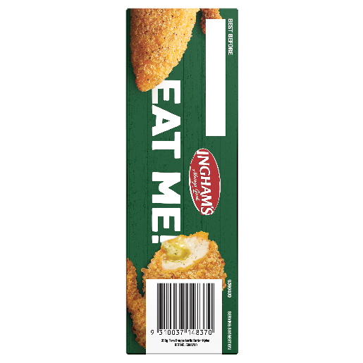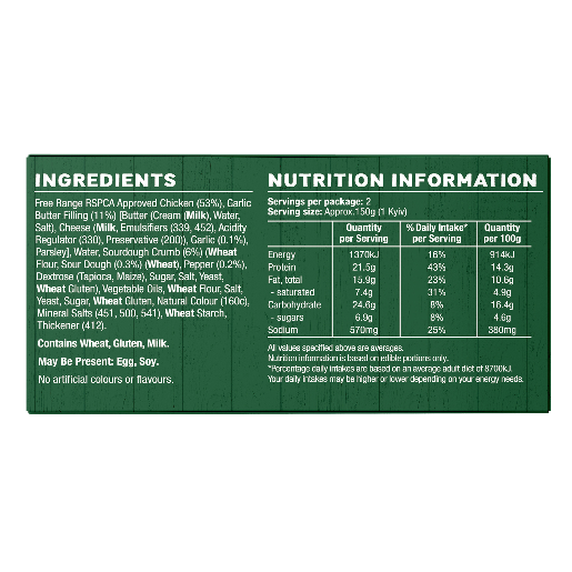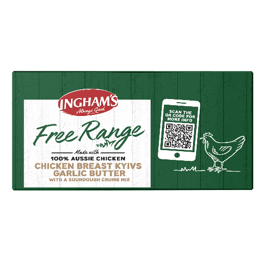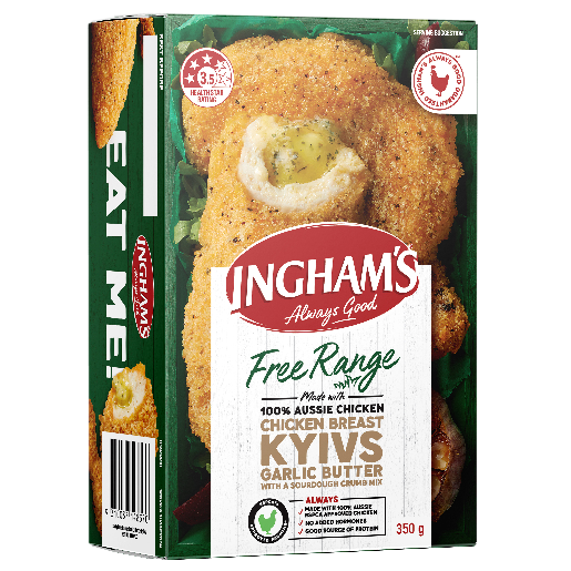 Ingham’s Free Range Chicken Breast Kievs Garlic Butter with a sourdough crumb mix. Made with 100% Aussie chicken. Contains no added hormones and has a good source of protein.