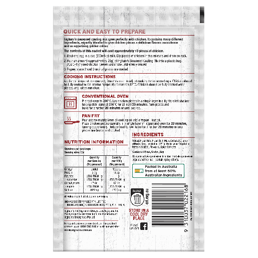 Ingham’s seasoned coating mix goes perfectly with chicken. It contains many different ingredients, expertly blended to give chicken pieces a delicious flavour, succulence and an appetising golden colour.