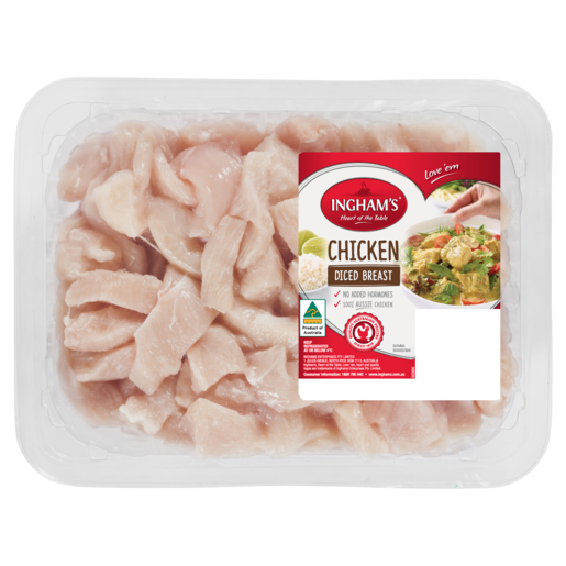 Ingham’s Fresh Diced Chicken Breast. Made with 100% Australian chicken with no added hormones.