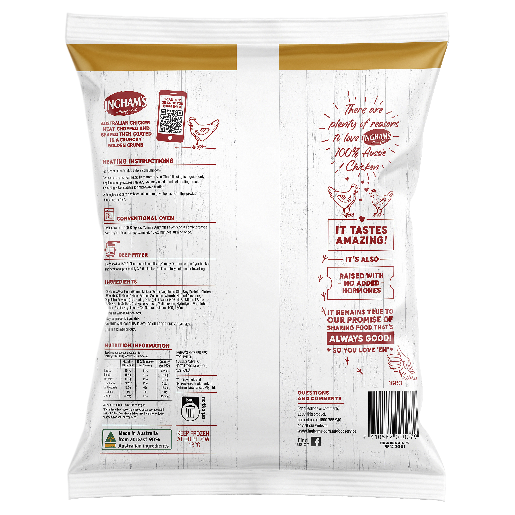 Ingham’s Original Yummy Drummies are made with 100% Aussie chicken. Australian chicken meat, chopped and shaped then coated in a crunchy golden crumb. Always no added hormones and good source of protein.