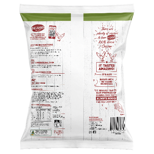 Ingham’s Country Crisp Chicken Strips are made with 100% Aussie chicken. Australian chicken meat, chopped and shaped then coated in a crisp spicy coating. Always no added hormones and good source of protein.
