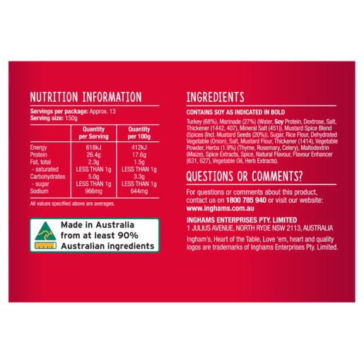 Turkey (68%), Marinade (27%) (Water, Soy Protein, Dextrose, Salt, Thickener (1442, 407), Mineral Salt (451)), Mustard Spice Blend (Spices (Incl. Mustard Seeds (20%)), Sugar, Rice Flour, Dehydrated Vegetable (Onion), Salt, Mustard Flour, Thickener (1414), Vegetable Powder, Herbs (1.9%) (Thyme, Rosemary, Celery), Maltodextrin (Maize), Spice Extracts, Spice, Natural Flavour, Flavour Enhancer (631, 627), Vegetable Oil, Herb Extracts).