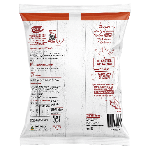 Ingham’s Sweet Chilli Chicken Tenders is fully cooked and a new recipe. Always no added hormones, made with 100% Aussie chicken and a good source of protein. Ingham’s Always Good Guaranteed.