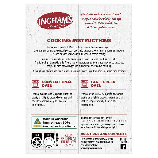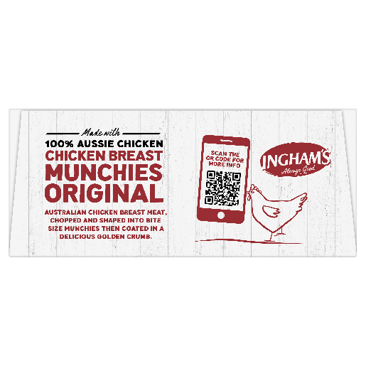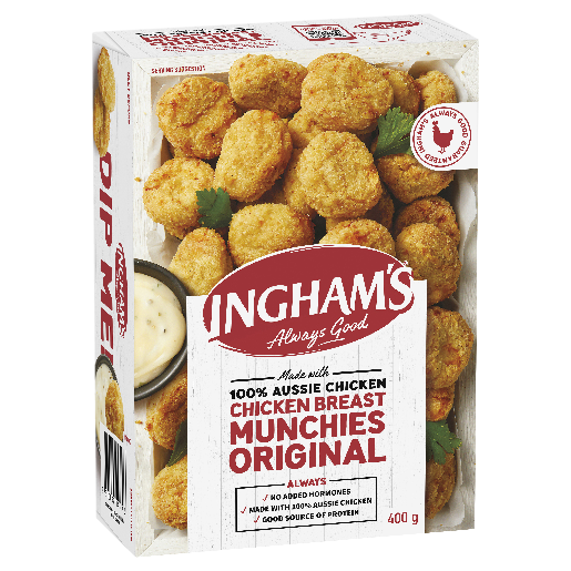 Ingham’s Chicken Breast Munchies Original is Australian chicken breast meat, chopped and shaped into bite size munchies then coated in a delicious golden crumb. Made with 100% Aussie chicken. No added hormones and has a good source of protein.