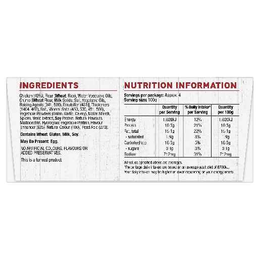Chicken (49%), Flour (Wheat, Rice), Water, Vegetable Oils, Crumb [Wheat Flour, Milk Solids, Salt, Vegetable Oils, Raising Agents (341, 500), Emulsifier (481)], Thickeners (1404, 407), Salt, Mineral Salts (450, 500, 451, 508), Vegetable Powders (Onion Garlic, Celery) Maize Starch, Spices, Yeast Extract, Soy Protein, Natural Flavours, Maltodextrin, Hydrolysed Vegetable Protein, Flavour Enhancer (635), Natural Colour (100), Food Acid (270).