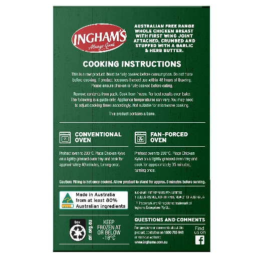 Ingham’s Free Range Chicken Breast Kievs Garlic Butter with a sourdough crumb mix. Made with 100% Aussie chicken. Contains no added hormones and has a good source of protein.
