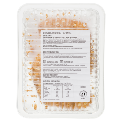 Australian Chicken Breast meat, chopped and shaped into schnitzels then lightly coated in a crispy gluten free crumb.